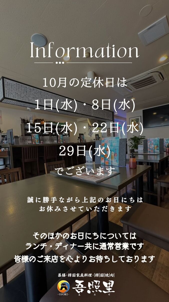 📢 10月の定休日のお知らせ – 倉敷駅すぐ・本格韓国料理オジョリ【吾照里】